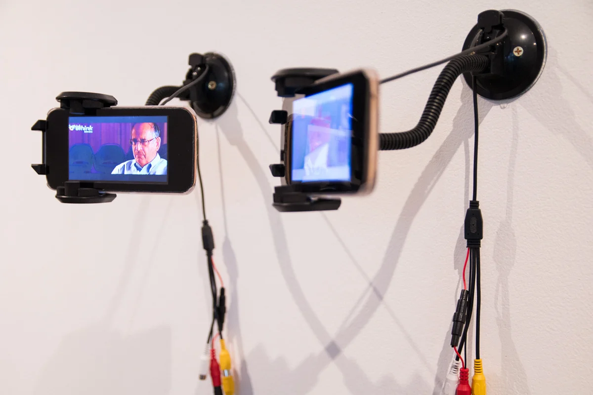 LCD screens, MDF, cardboard, heat shrink plastic, Samsung Galaxy S5 phone cover, and found video.